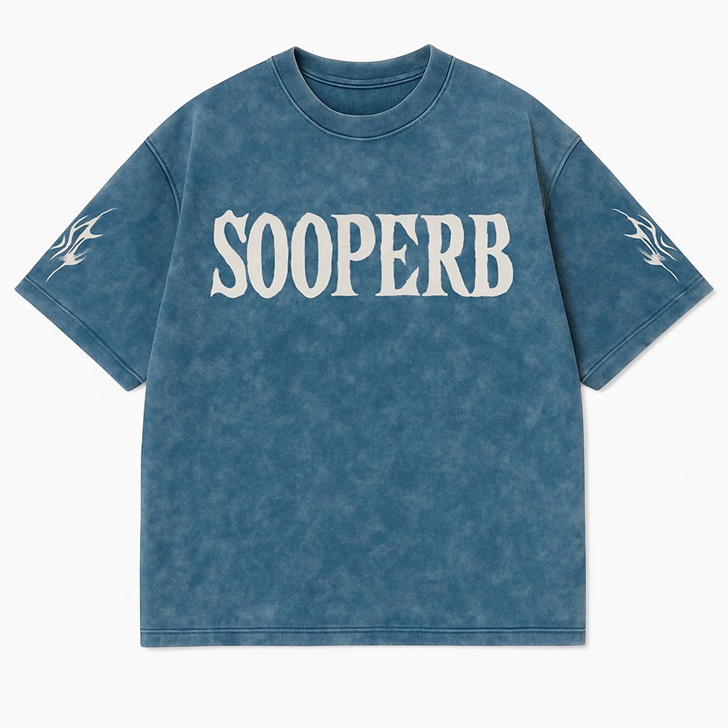 The oversized fit gives a relaxed and modern streetwear vibe, while the premium pigment-dyed fabric enhances its trendy washed-out look. Featuring the signature SOOPERB logo on the front and flame graphics on both sleeves, this tee is designed for fashion-forward individuals who love standing out.
